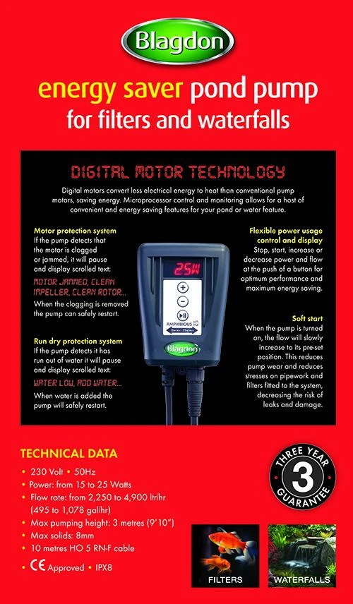 Amphibious IQ Variable Flow energy saving pond pump 2250-4500 for filters and waterfalls. The new adjustable flow pumps come with the latest digital motor technology and microprocessor as the flow is adjusted the wattage also adjusts saving on electricity. This small feature packed pump comes with a Blagdon 3 year Guarantee.