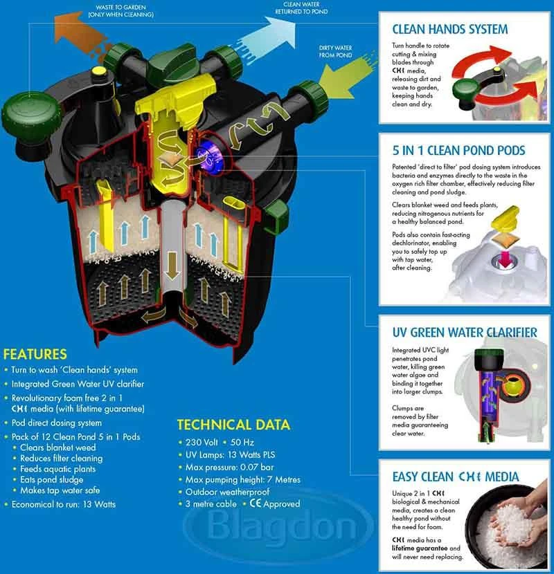 The Clean Pond Machine 13000 is a very effective easy-to-use filtration system that keeps your pond clean and healthy. With its unique innovative foam-free design give you a filter that deals with and prevents the issues that come with pond-keeping. When used with blagdon’s clean pond pods placed directly in to the 13000-filter dosing system the soluble pouches get to work straight away adding bacteria and other active ingredients to clean and clear your pond. Clean pond pods are pet and wildlife safe and reduce filter cleaning encourage plant growth boost bacteria and act against sludge, algae, blanket weed and makes tap water safe. They can also be used directly in to the pond and with other filter systems. 9 pods are included with your filter.