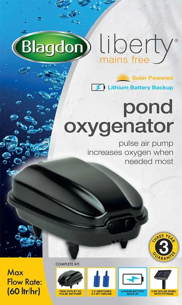 The Blagdon Liberty Solar Air Pump Kits are very easy to set up to keep your pond oxygenated. The pump is powered by a 0.8w solar panel with battery back up. Sunlight on the solar panel produces more energy than the pump needs to run, the excess power is stored in the battery. If the solar panel is not receiving any light the power stored in the lithium battery is used to run the pump. The kit includes everything you need in the box with the pump are 2 x air stones and 2 x 6 feet of air line.