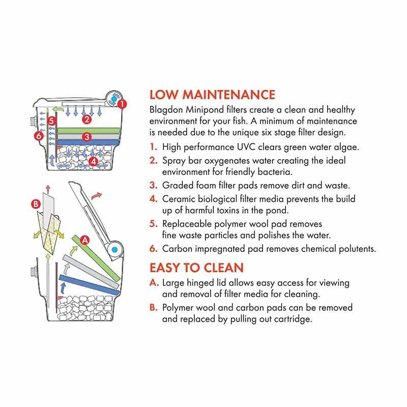 The Minipond 9000 box filter will keep your pond clean and healthy with its unique 6 stage filtration system.The filtration design keeps maintenance to a minimum giving your more time to enjoy your pond. The mini pond filter has a 5w UVC to clear algae and a spraybar to oxygenate the water perfect for friendly bacteria.