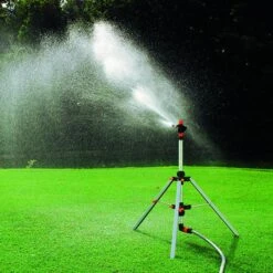 Claber Impact Pulsating tripod sprinkler kit with 0? to 360? circle coverage or continuous rotation, mounted on a height adjustable tripod. Easy hose pipe connection with quick click at the base. A diffuser screw assures even water distribution. A self-adjusting sprinkler head for high water pressures up to 4 bar for optimal water spray. A stainless steel pin and wear-resistant bronze bushing and ABS plastic make this a tough lawn sprinkler kit.