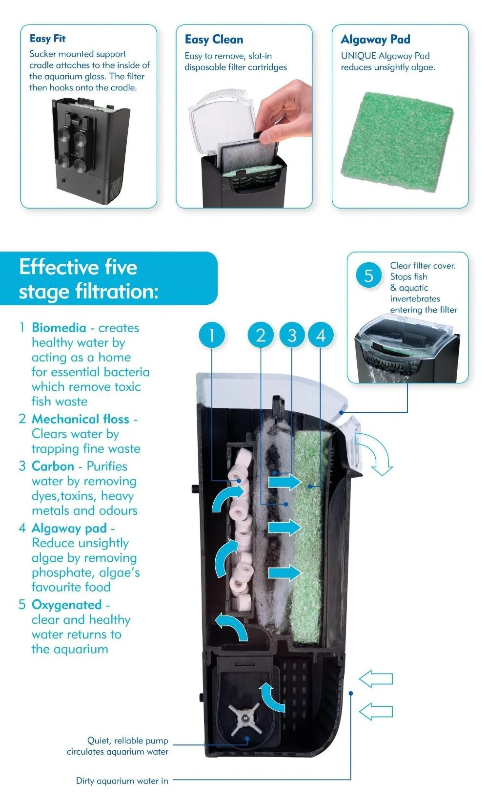 The CF2 filter has all the features needed to keep your aquarium clean and healthy. This supper quite filter will keep your water balanced with the ceramic tubes creating the perfect environment for good bacteria to flourish. Along with cleaver algae prevention spheres and mechanical floss cartridges to sieve out waste and active carbon purifying the water all help keeping the algae at bay. Cleaning your filter couldn’t be easier with an easy flip up hinged lid and easy replacement cartridges simply pop in and out saving time minimising maintenance.